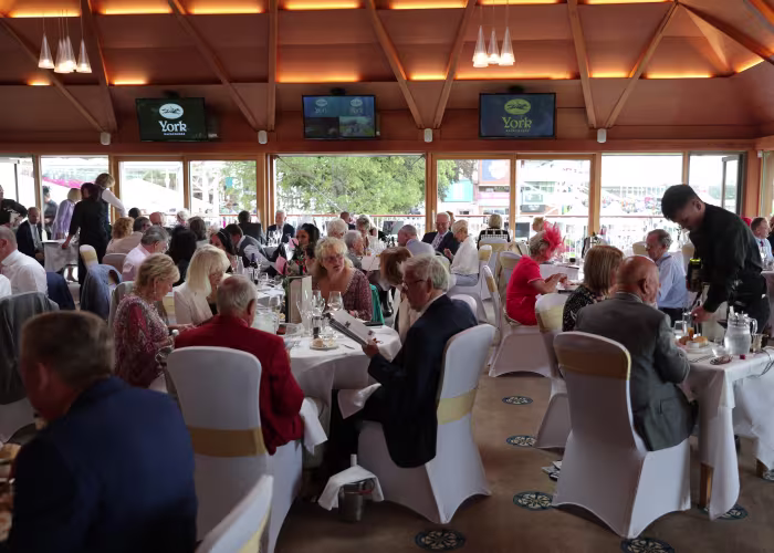 This restaurant is located on the third floor of the Knavesmire Stand with floor to ceiling windows and a private grandstand balcony with ample viewing seats overlooking the home straight and spectacular views of the final furlong.