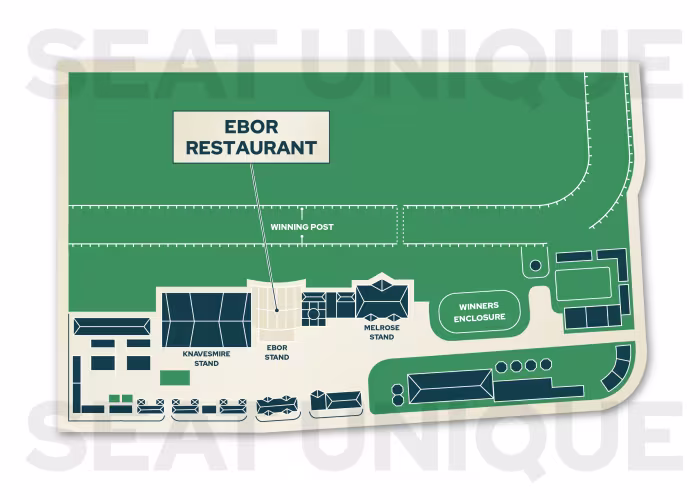 This restaurant is located on the fourth floor of the Ebor Stand with floor to ceiling windows and a private balcony overlooking the home straight and spectacular views of the final furlong.